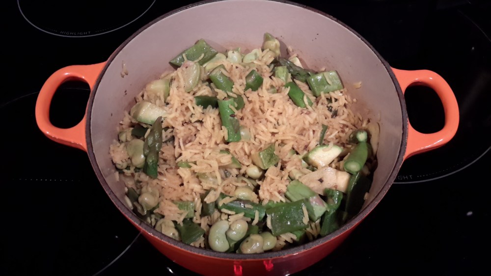 I need to try a new recipe with the broad beans. Broad bean and courgette pilaf inspired by lovely Simon Rimmer, he does good veggie recipes.. As per usual didn’t quite have the full ingredients but I did have some asparagus and runner beans. The recipe also requested to slice and griddle the courgettes but it was a one pot dinner tonight so they got chucked in at the sauté stage. It is smelling pretty good. In an attempt to get more recipes on my blog I have taken to writing while the food cooks.