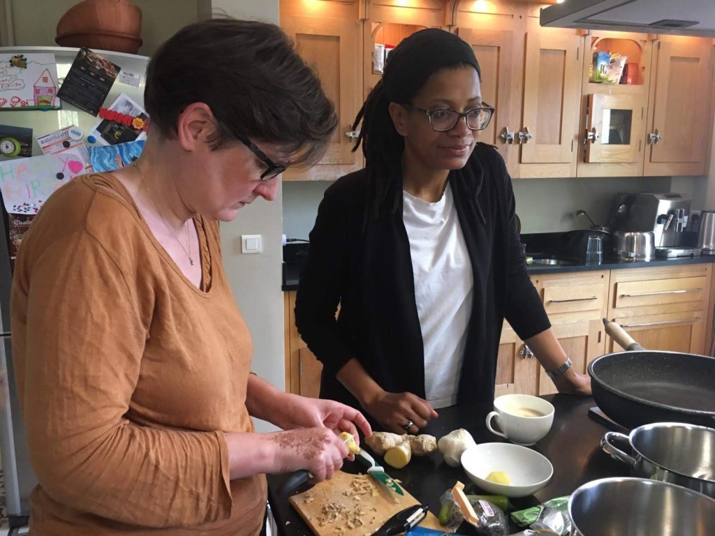 I had a lot of fun last Friday. I agreed to run a cooking class for Maisons-Laffitte International Association. I ran a class cooking Keralan chicken curry , a vegetarian version with vegetables and chick peas to replace the chicken, spiced vegetable basmati rice and raita. We cooked poppadoms and had chutneys and pickles followed by an Indian sweet called Burfi. I even found some Bombay mix to nibble on while we cooked.