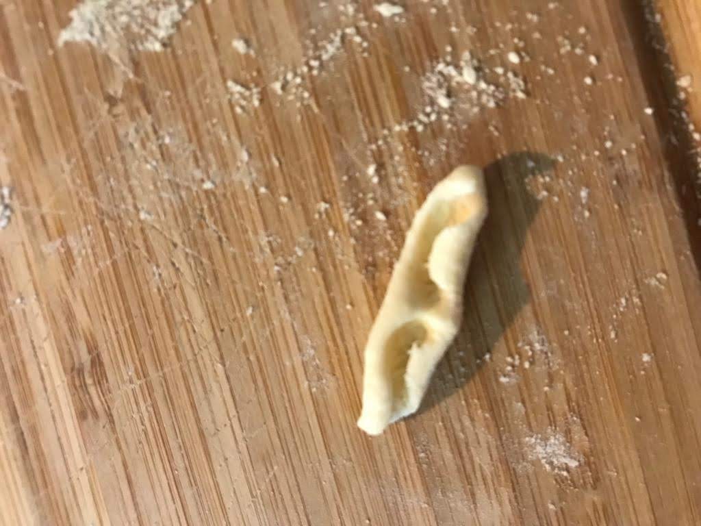 Make a well in the flour on the worktop, pour a little water into the well and pull the flour together until you get a soft dough that doesn’t crack when you roll it out. Cut the dough into strips and then, using your finger tips, pull the dough towards you so that it curls in on itself as in the picture. This is easier on a wooden chopping board than on a stone work top. Lay all the pasta on a tray and leave to dry while you make the sauces. When your sauces are ready, then you can cook in boiling, lightly salted water until al dente. The time will depend on the size and thickness of your pasta shapes.