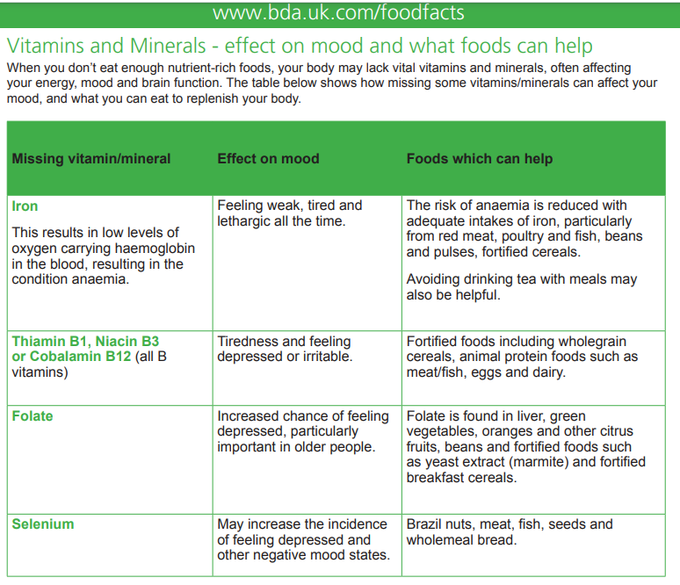 Foods that are rich in micronutrients are important. The machinery of releasing energy, making neurotransmitters, the health and working of the nervous system and brain needs lots of different micronutrients. This summary from the British Dietetic Association highlights some of the main links between micronutrients and mood.