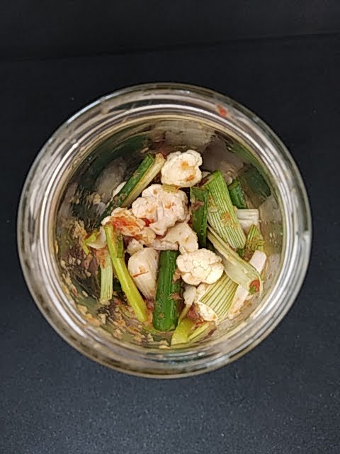 The first challenge set is to make Kimchee, simply explained as a spicy Korean sauerkraut – fermented vegetables with Korean chilli flakes, garlic and ginger. I am looking forward to using it in some Korean dishes.